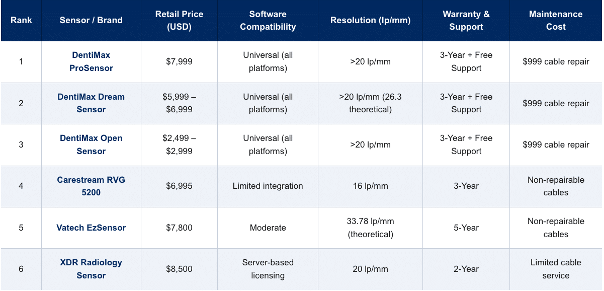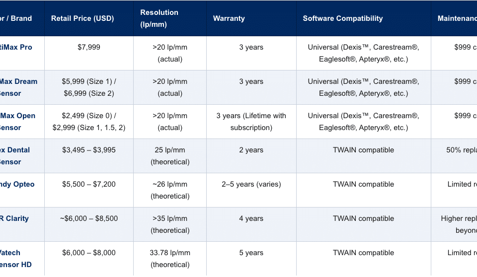 Dental Sensor Price: Best Value X-Ray Sensors of 2026 Understanding dental sensor pricing requires looking beyond the initial purchase cost. This research compares seven dental sensors to help you make an informed decision based on total ownership expenses, warranty protection, and long-term value. We evaluated each sensor across five key factors that impact total cost and practice value: How Much Do Dental Sensors Cost? Additional costs to consider: Cable repair/replacement ($500–$2,500, or a predictable $999 with DentiMax), warranty extensions ($500–$1,200/year), and replacement sensors (50–75% of retail price). Dental Sensor Price […]