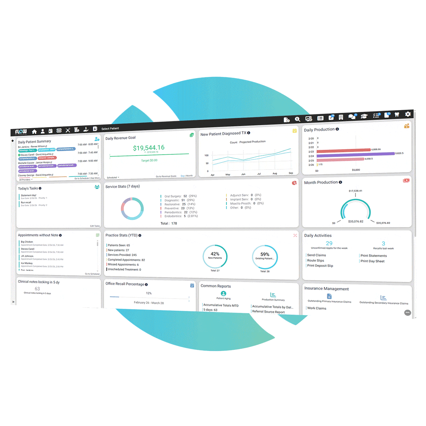 - Real-time visibility into production, collections, and insurance claims